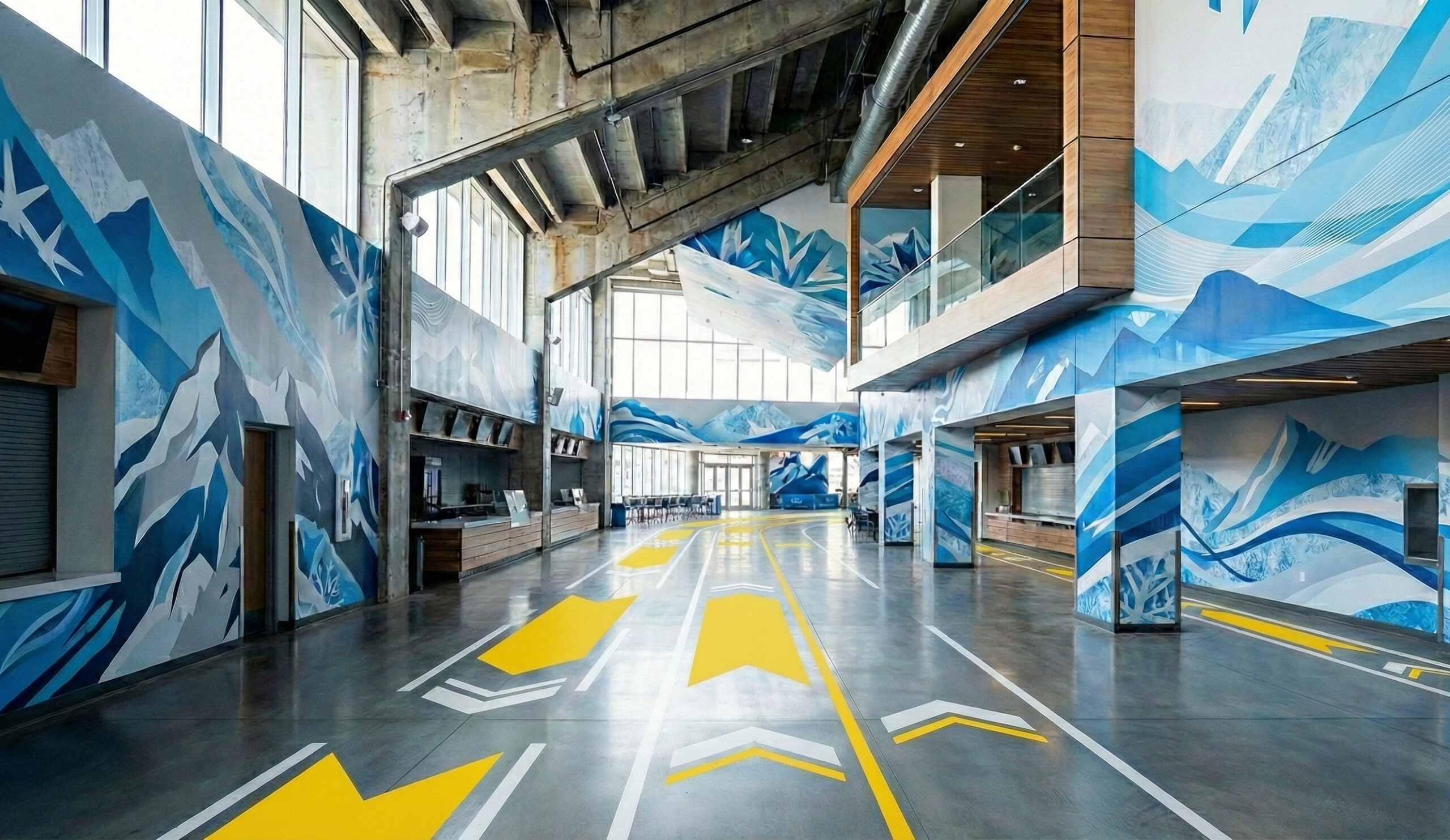 Floors play a critical role in wayfinding and crowd flow. Adventurescapes is ideal for directional floor graphics and temporary messaging, while Floorscapes flooring delivers durable, high-impact visuals for concourses and high-traffic branded areas.